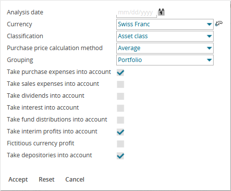 Many tabular analyses in the "Customers" area have various parameters that you can set. To configure the settings known from Infront Portfolio Manager: