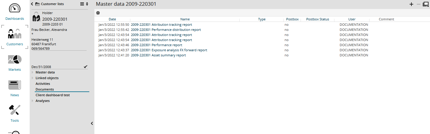 You can open the document list (provided you have the corresponding permission) by using the navigation pane in the securities account object view (holder, portfolio, account, securities account) and clicking the "Documents" menu item. The document list shows all documents for the securities account object. In addition to the generated PDFs, there can also be attached text documents or graphic files. You can sort the list by date, name, type or user by clicking the column header.
