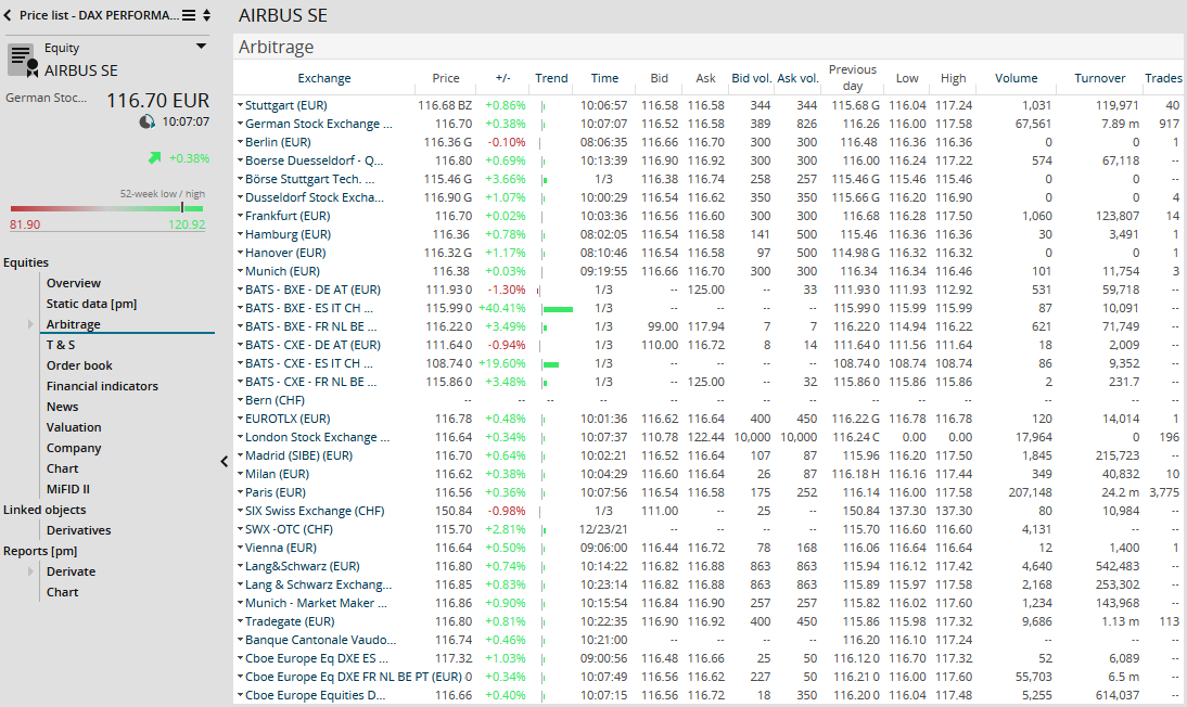 Time & Sales provides you with tables showing opening, high, low and closing prices and turnover for the selected security, divided into historical data and intraday data.