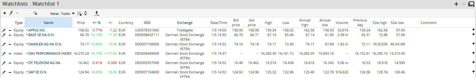 In the "Table" view, you see the securities in the classic list form: