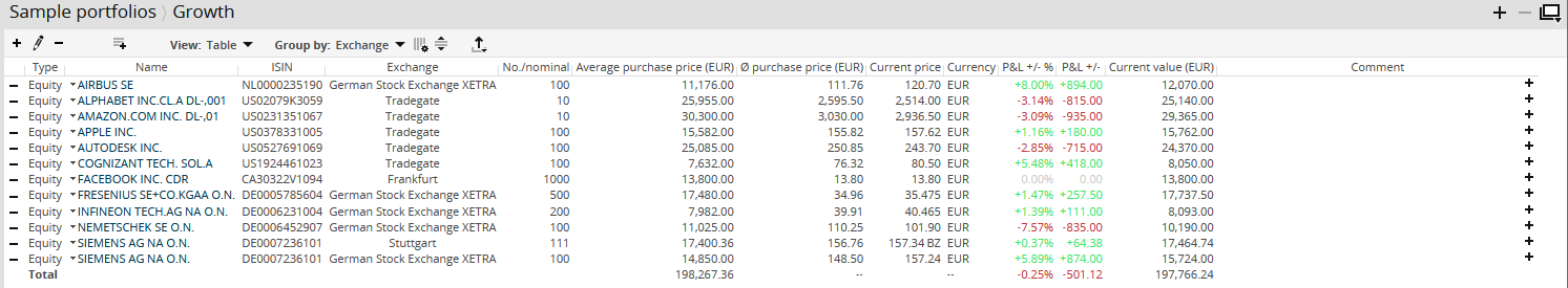 In the "Table" view, you see the securities in the classic list form: