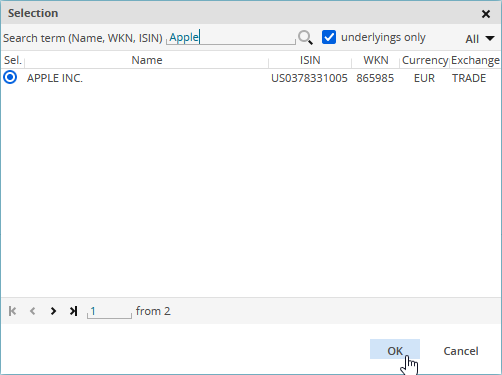 By using the drop-down list to the right, you can limit the search to certain types of securities. By default, the search includes all security types ("All"). The number of securities found for a type is shown in brackets. - Select the the corresponding underlying in the list and confirm with "OK".