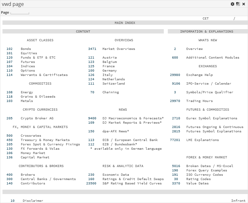 The "vwd site" market data widget shows the familiar vwd pages. As usual, you can enter the required page number in the "Page" input field (for example, "5009" for "DAX-XETRA") and confirm by pressing <RETURN> to go to this page.