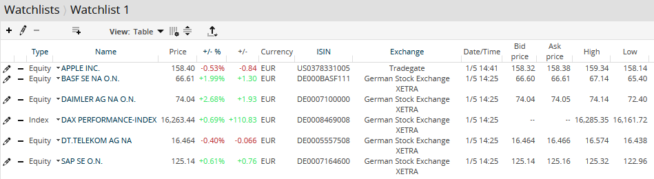 Use watchlists to follow your favourite securities. In addition to the table display, see also the cart gallery for the positions.